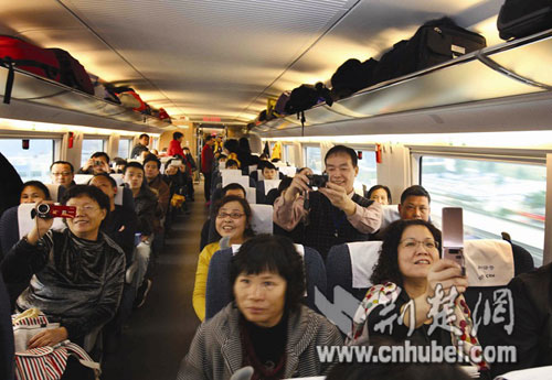 荊楚網(wǎng)消息 (楚天金報(bào)記者譚新杰 通訊員郭金富、劉強(qiáng))12月26日上午9時(shí),三列嶄新的時(shí)速350公里“和諧號(hào)”高速列車從武漢站、長(zhǎng)沙站和廣州北站同時(shí)首發(fā),標(biāo)志著目前世界上運(yùn)營(yíng)速度最快、一次性建成里程最長(zhǎng)的高鐵新干線——武廣客專正式投入運(yùn)營(yíng)!瓣懙仫w行下廣州,千里南國(guó)一日還”的時(shí)代已經(jīng)到來。