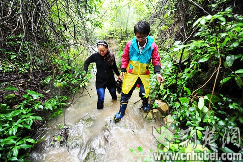 一路的泥濘。3個(gè)人穿過大片的莊稼地、鉆進(jìn)灌木叢,沿山澗小溪一路尋去,直到約兩公里外的一處“小瀑布”旁。